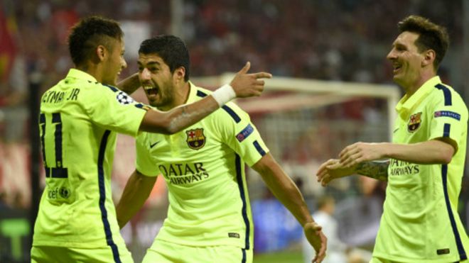 Messi,Suarez na Naymar wakishangilia bao
