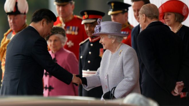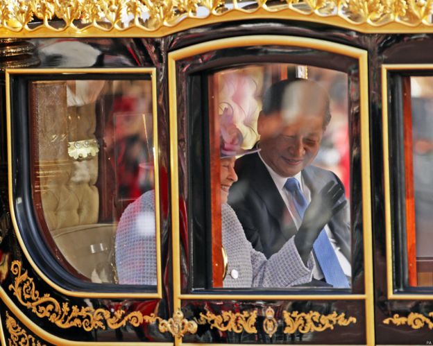 Malkia Elizabeth pamoja na mmewe Prince Philip walimkaribisha rais Xi Jinping na kama sehemu ya makaribisho kabambe milio ya mizinga 41 ilitikisa jengo la mnara mkuu wa London na katika medani ya Green Park jijini London.